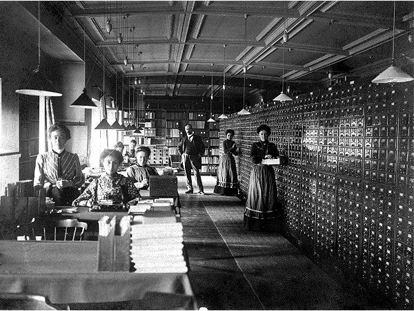 O romance acabou de ser adaptado por Park Chan-wook (Oldboy [Trilogia da Vingança], Snowpiercer, A Criada) no filme Sem Outra Escolha (2025), que ainda não assisti. Como baita olheiro que sou (mêooo), comprei o livro na baixa por R$ 10 (edição de 2001 da Companhia das Letras) no sebo. Lembrando que o RelevO completou 15 anos e – conta-se – foi vendido a uma casa de apostas. Até breve! HIPERTEXTOMundaneumO advogado Paul Otlet, nascido no século 19, era ambicioso. Eu disse ambicioso? Esse belga tomava ambição no café da manhã; fervia confiança na chapa e a devorava com um molho sabor Delírio de Grandeza. Isso porque, em um misto de Wikipédia com Bioshock, ele queria catalogar todas as informações de nosso planeta, armazenando-as em cartas índice, por sua vez guardadas em gavetas como as da foto acima.