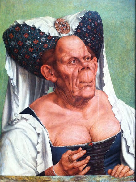 Na década de 1930, o Mundaneum já ocupava 150 salas do Palais du Cinquatenaire, em Bruxelas, atraindo milhares de visitantes, os quais podiam tirar dúvidas sobre temas que se deslocavam da higiene bucal às finanças da Bulgária. O projeto recebia um bom investimento por parte de La Fontaine, que já havia conquistado o Nobel da Paz. Por fim, a história se torna mais interessante ao sabermos que Paul Otlet sonhava em transformar sua criatura em uma rede que os cidadãos poderiam acessar de suas próprias casas. Já pensou????? A essa altura, o governo já estava de saco cheio de tanto espaço para pouco retorno e basicamente despejou seu pioneiro. A equipe foi reduzida a um grupo de voluntários, e sua residência esteve empilhada de papeis e mais papeis. Otlet morreu em 1944, e a Segunda Guerra Mundial certamente não ajudou a conservar o material todo. De todo modo, sua influência na consolidação de redes, e, consequentemente, da internet, é imensa. Em Mons, ainda na Bélgica, há um museu em homenagem a essa biblioteca borgiana. Duquesa FeiaA Duquesa Feia, ou Idosa Grotesca, do holandês Quentin Matsys, é uma alegoria sobre luta contra passagem do tempo e o desencontro com os hábitos de sua época. Uma senhora de idade posa adornada com vestimentas da juventude – já fora de moda –, um pitoresco chapéu e seios tão voluptuosos quanto enrugados à mostra, sugerindo uma vaidade talvez excessiva. Essa temática aparece também no ensaio Elogio da Loucura, de Erasmo de Rotterdam, publicado dois anos antes do quadro. No livro, Erasmo se refere a senhoras que “não conseguem sair de perto do espelho” e “não hesitam em expor seus repulsivos seios”. O que mais chama a atenção é o contraste da indumentária da personagem com seu rosto grotesco. Por muito tempo, a origem dessas feições aberrantes foi objeto de debate, até a clamorosa sugestão de que a modelo, na verdade, sofria da Doença de Paget, a qual só seria descrita trezentos anos mais tarde. Essa condição envolve um crescimento desenfreado de alguns ossos. Tal crescimento provoca deformações como as da pintura. Por séculos, pensava-se que Matsys havia copiado uma gravura de Leonardo Da Vinci. Recentemente, no entanto, ficou esclarecido como foi Leonardo, ou alguém de seu ateliê, quem copiou o holandês, já que ambos os pintores trocavam correspondências e desenhos. A “duquesa grotesca” se tornou, inclusive, inspiração principal para o ilustrador John Tenniel desenhar a duquesa do livro Alice no País das Maravilhas: